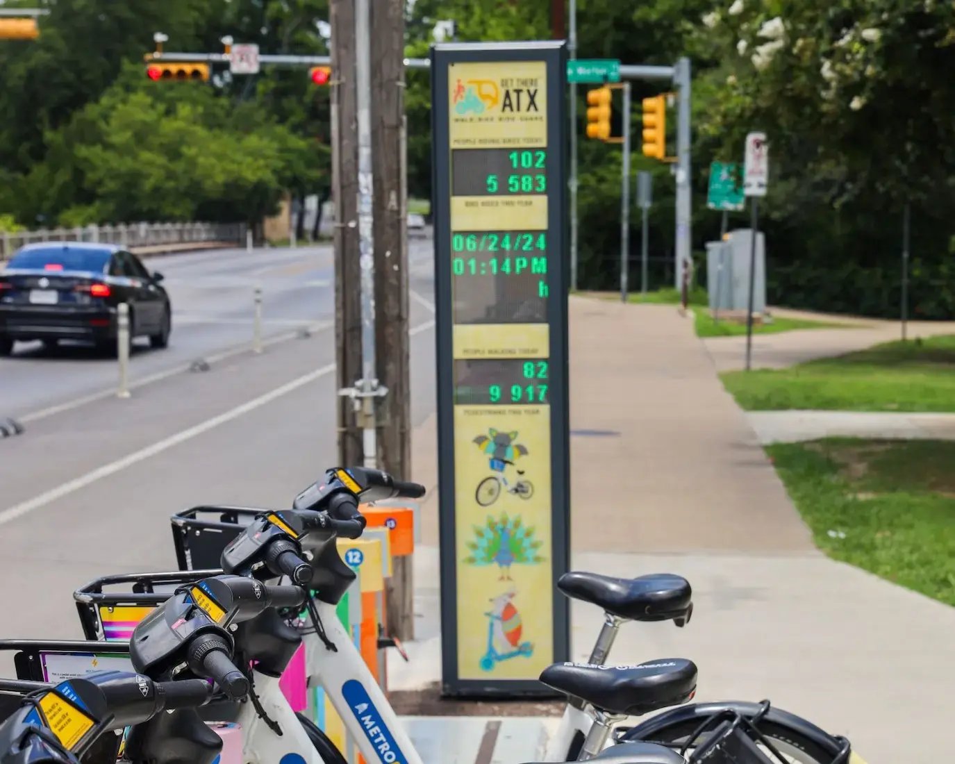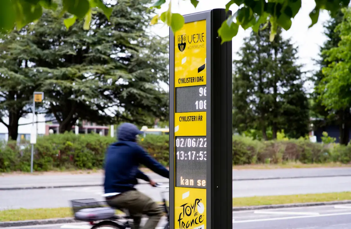 A high-visibility, real-time count data display for bicycles, pedestrians, scooters that shows dynamic, customizable text to passers-by.