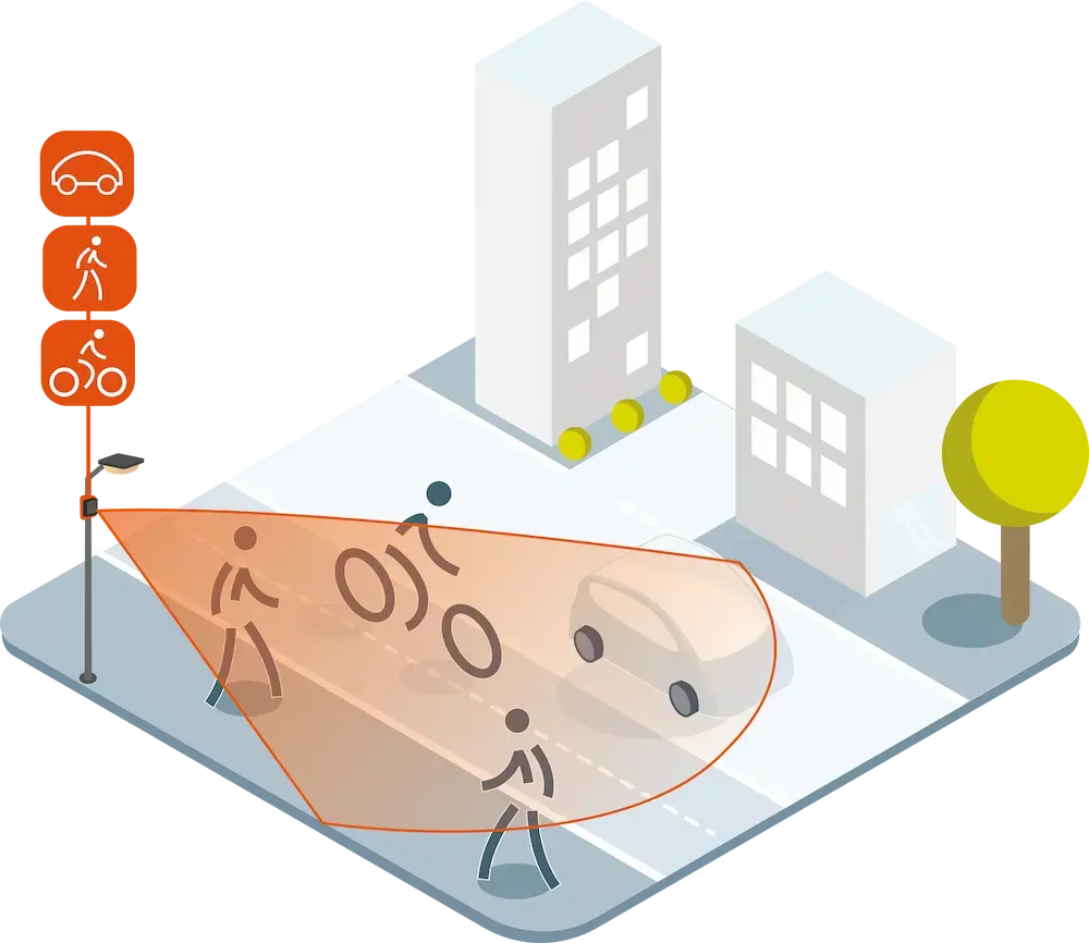 The radar sensor performs real-time tracking to transmit only counting, speed, and direction data. No images or personal data are captured or transmitted.